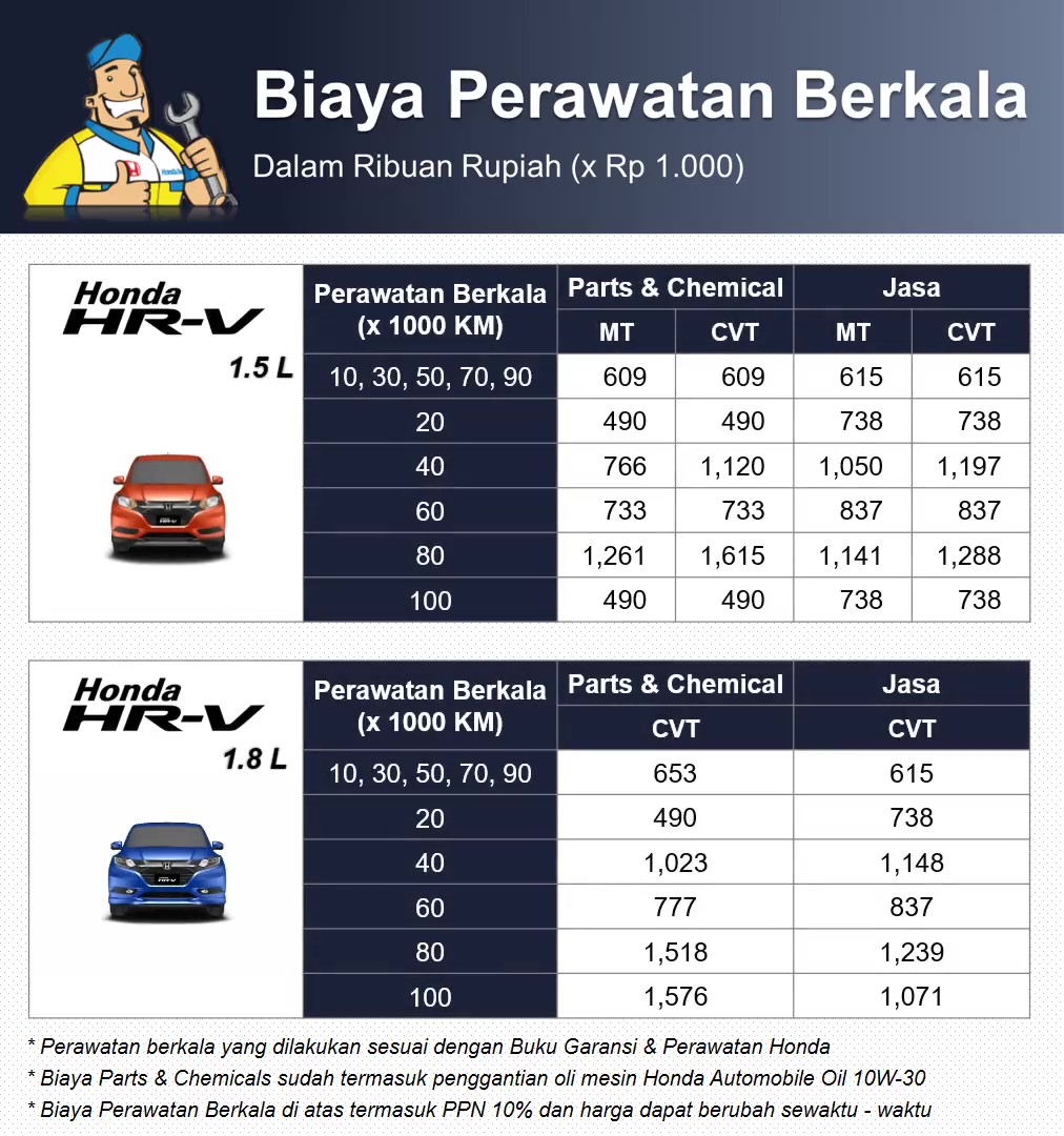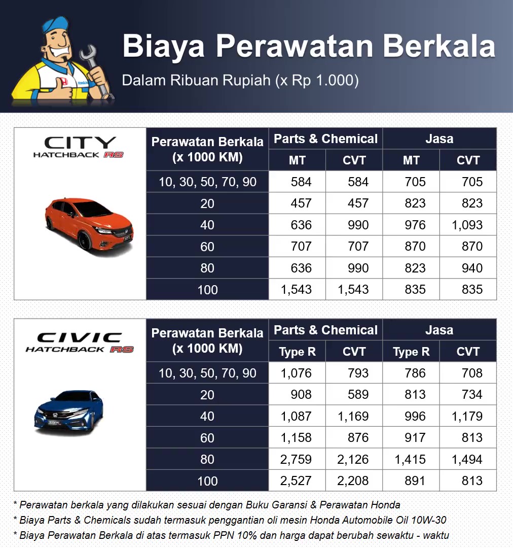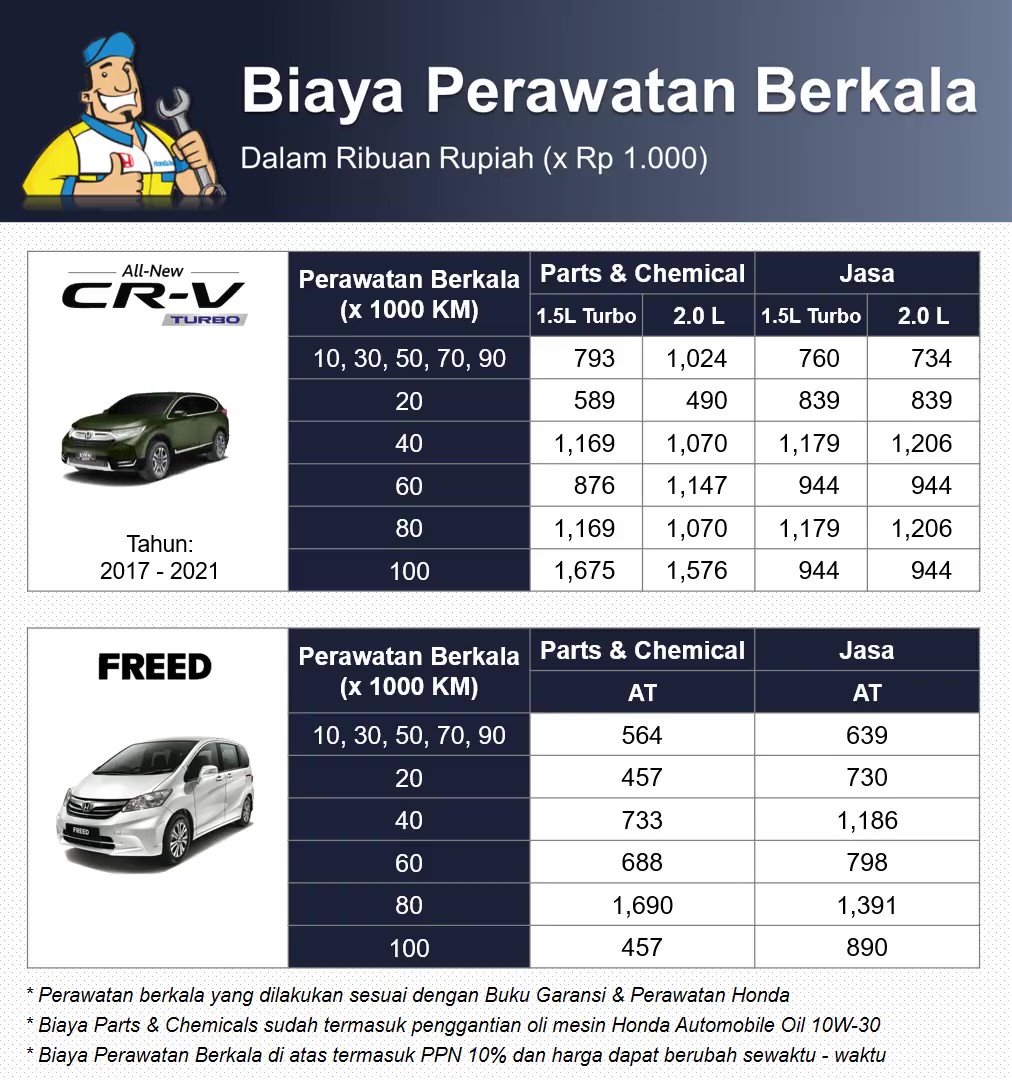 Berikut ini adalah Estimasi Biaya Perawatan Berkala yang dilakukan sesuai dengan buku Garansi & Perawatan Mobil Honda.